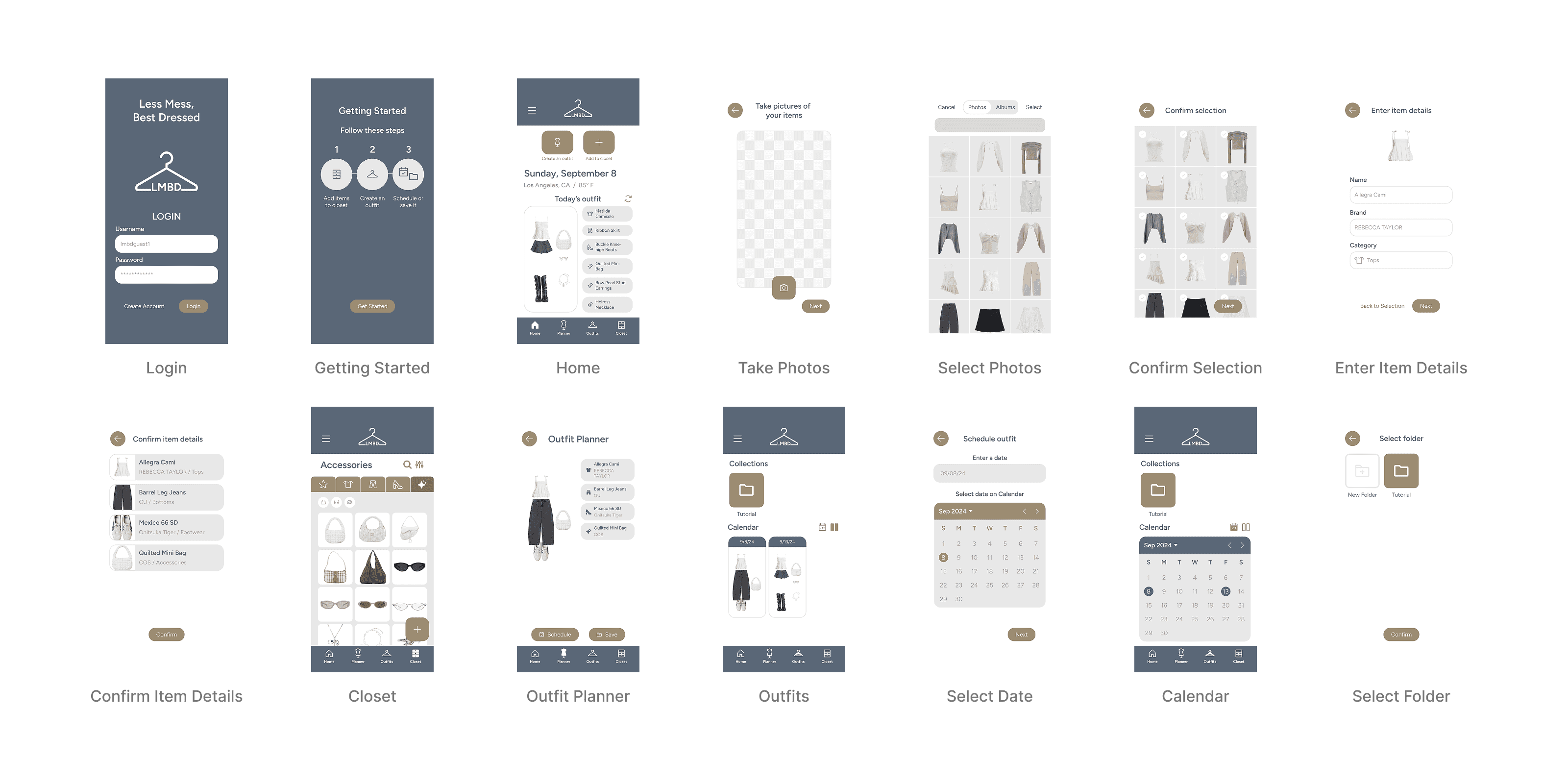 ‘Less Mess, Best Dressed’ is a mobile app that serves as both a closet manager and stylist. Users are able to upload and organize their physical items into a digital closet, then create and plan outfits using these items.